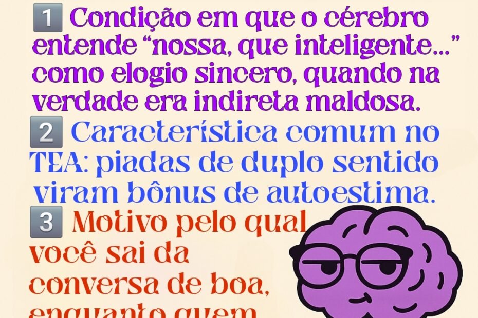 Substantivo tragicômico-social 1. Condição em que o cérebro entende “nossa, que inteligente…” como elogio sincero, quando na verdade era indireta maldosa. 2. Característica comum no TEA: piadas de duplo sentido viram bônus de autoestima. 3.… 🙃 Ironiômetro Quebrado™
