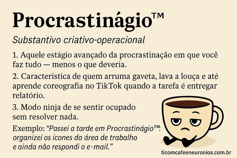 📖Substantivo criativo-operacional 1. Aquele estágio avançado da procrastinação em que você faz tudo, menos o que deveria. 2. Característica de quem arruma gaveta, lava a louça e até aprende coreografia no TikTok quando a tarefa… 💤 Procrastinágio™