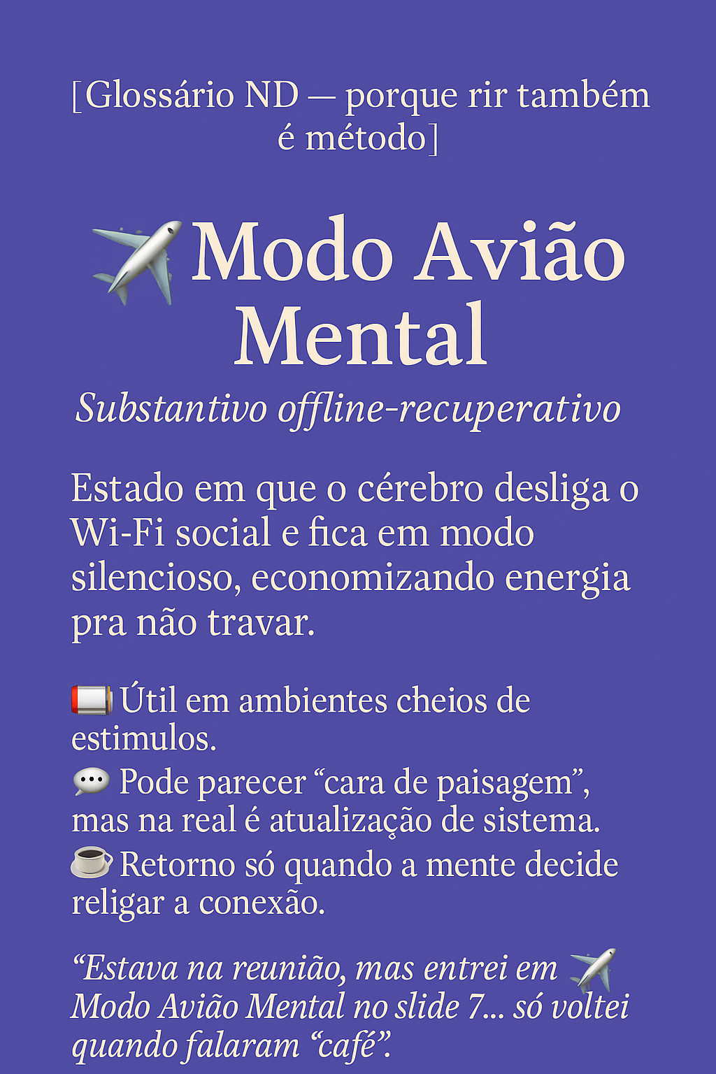 ✈️ Modo Avião Mental Definição:Quando o cérebro resolve entrar em modo offline sem avisar. Você tá lá, de corpo presente, mas a mente já ativou o “sem sinal, sem conexão, só silêncio”. Como reconhecer: Por… Modo Avião Mental