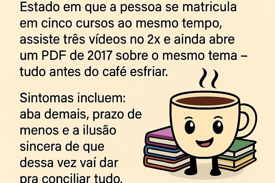📌 Substantivo entusiasmado-caótico Estado em que a pessoa se matricula em cinco cursos ao mesmo tempo, assiste três vídeos no 2x e ainda abre um PDF de 2017 sobre o mesmo tema, tudo antes do… 📖 Surto de Aprendência™